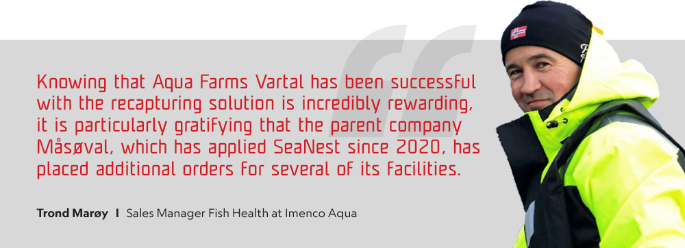 — Knowing that Aqua Farms Vartal has been successful with the recapturing solution is incredibly rewarding, it is particularly gratifying that the parent company Måsøval, which has applied SeaNest since 2020, has placed additional orders for several of its facilities, concludes Trond Marøy, Sales Manager Fish Health at Imenco Aqua.